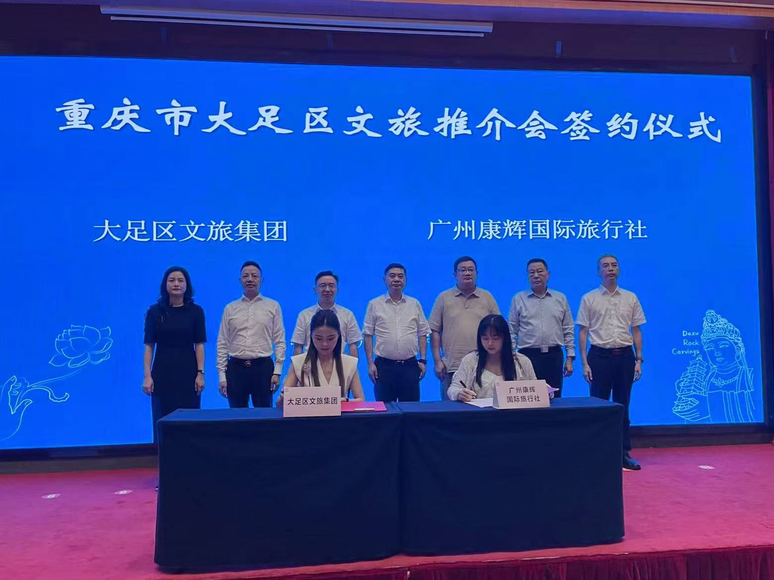 随后,大足区文旅推介官、重庆嗨皮游国际旅行社、一见教育科技相关人员,对大足旅游及研学资源进行了生动推介。活动现场,大足区文旅集团与广州康辉国际旅行社、广东千里行国际旅行社正式签署合作协议,共同优化文旅产品供给、激活消费市场,推动两地文旅从“文化交流”向“产业联动”扎实迈进。